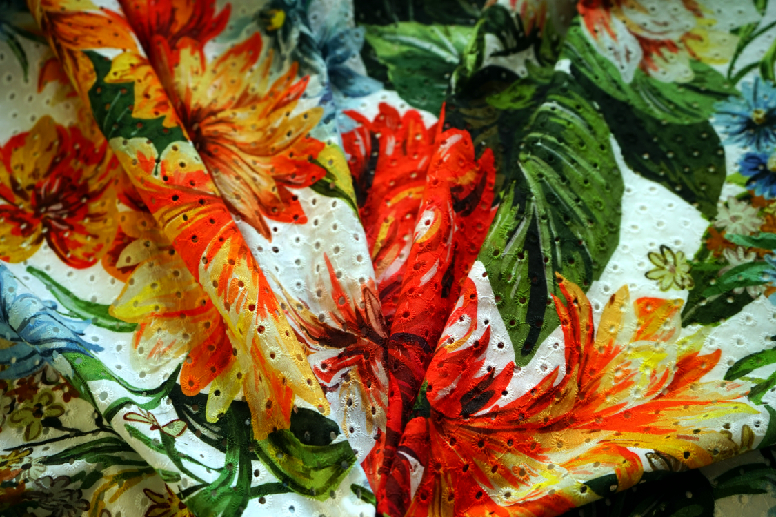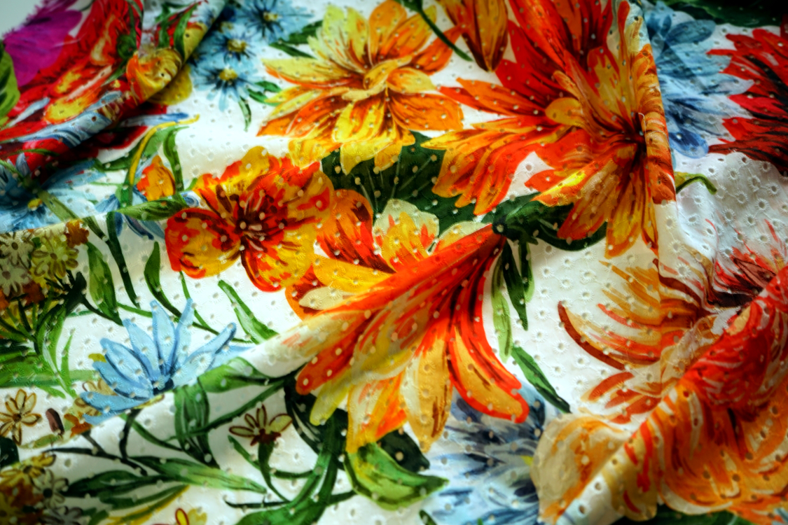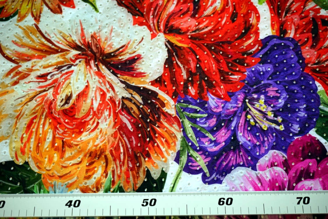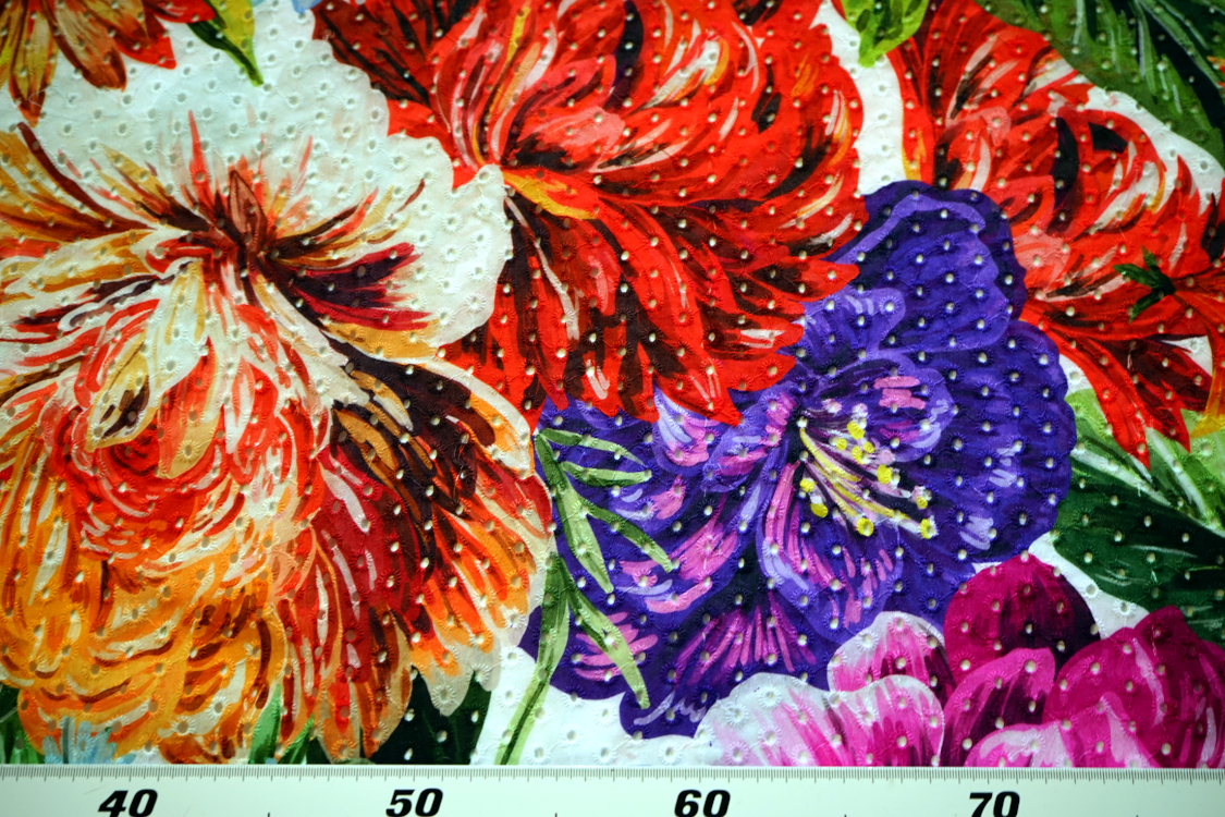 Włoski batyst ażurowy typu sangallo z pięknymi motywami kwiatowymi. Tkanina jest mięciutka, przewiewna, idealna na letnie dni. Nadaje się na sukienki, spódnice, bluzki. topy, tuniki.
