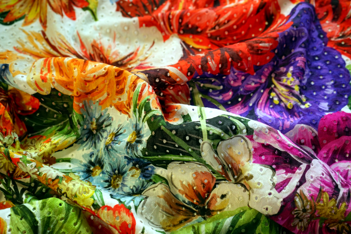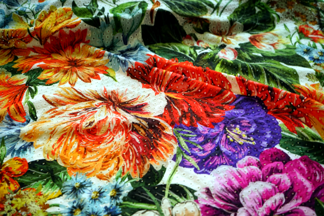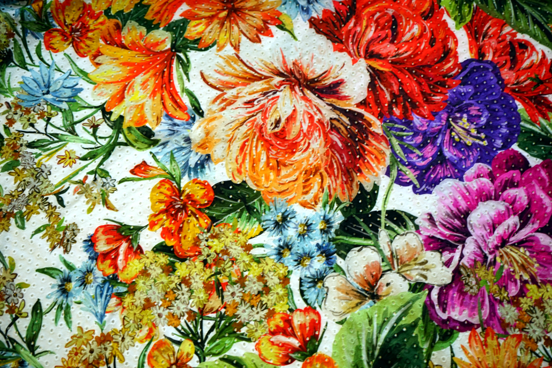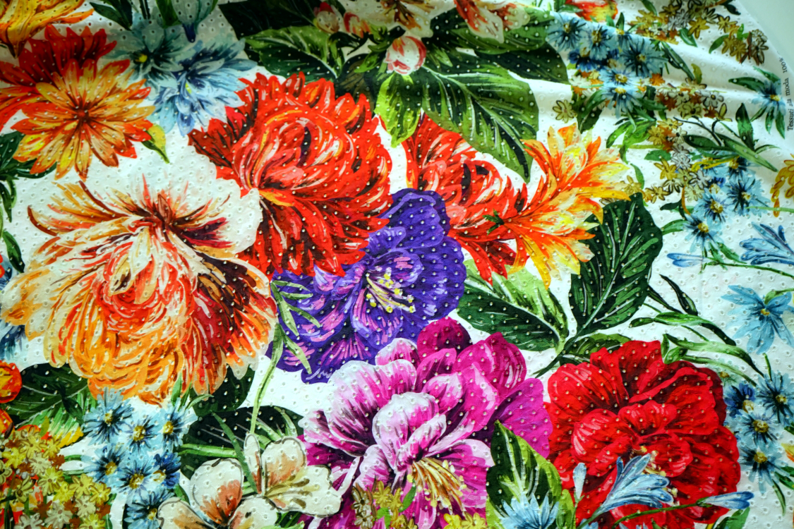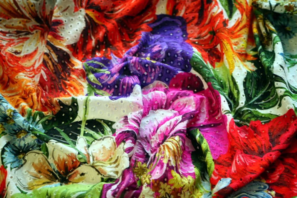 Włoski batyst ażurowy typu sangallo z pięknymi motywami kwiatowymi. Tkanina jest mięciutka, przewiewna, idealna na letnie dni. Nadaje się na sukienki, spódnice, bluzki. topy, tuniki.