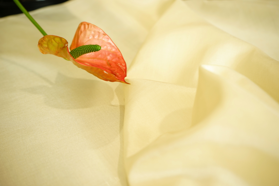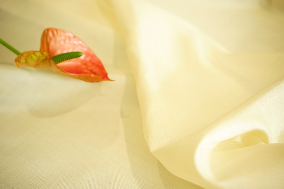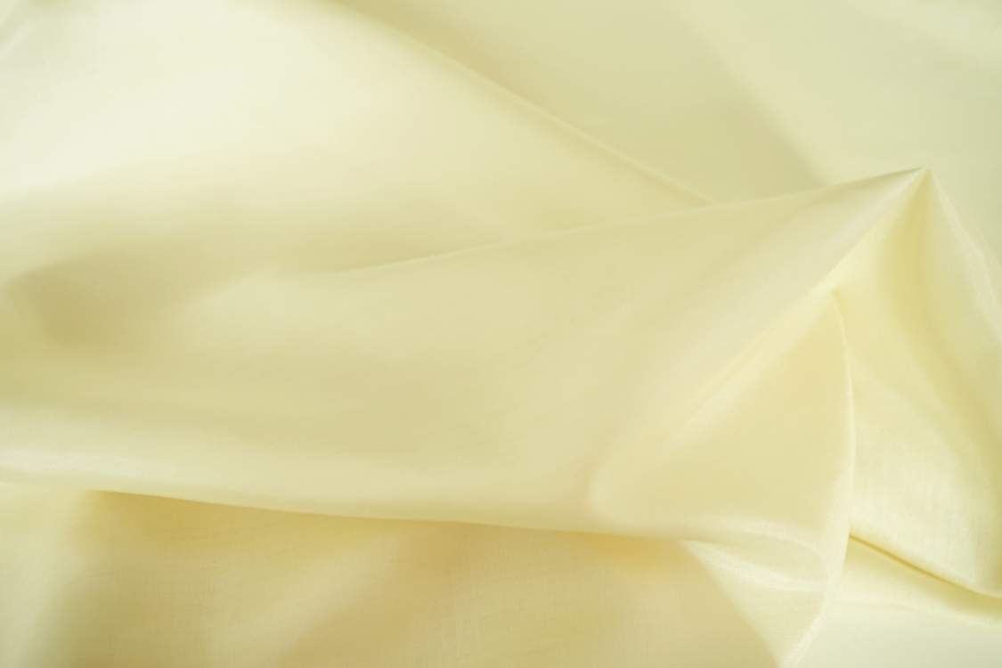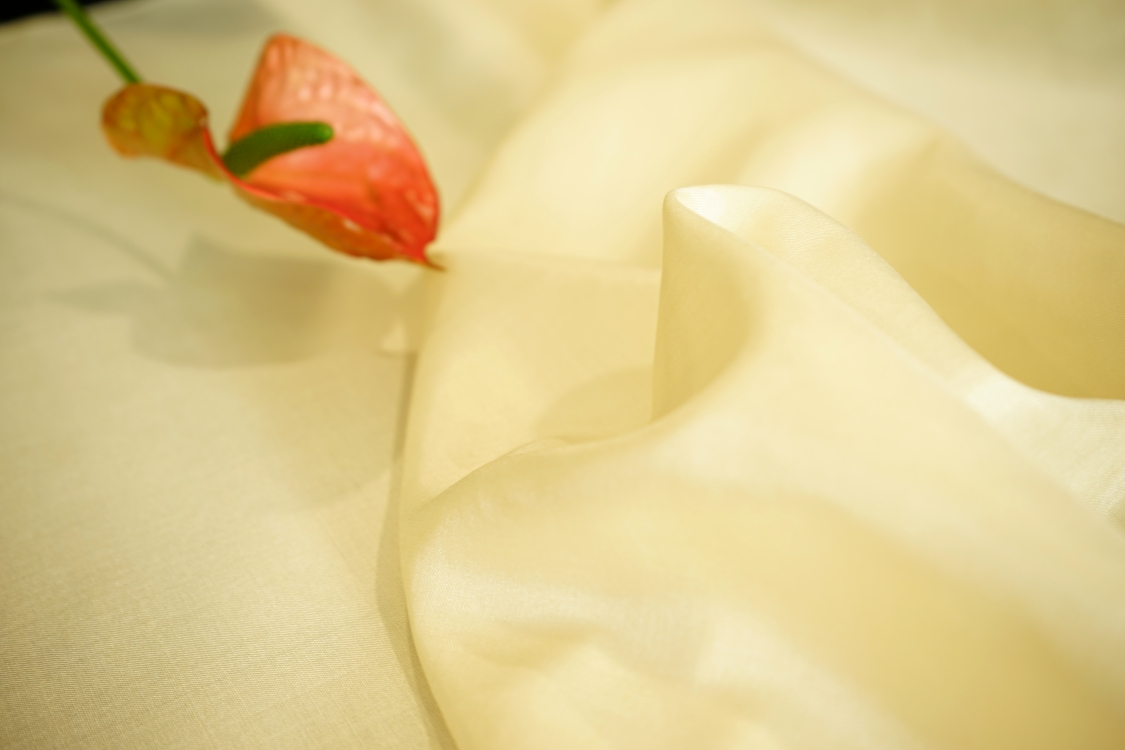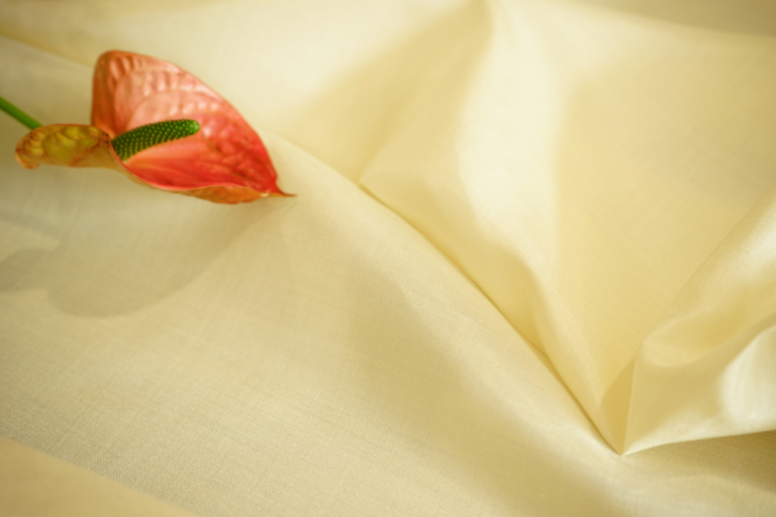 Elegancka tkanina jedwabna o prostym i widocznym przeplocie nitek i naturalnym lekkim połysku. Tkanina lekko sztywna. Nadaje się na sukienki, spódnice, bluzki, szale. Pod sukienkę i spódnicę podszewka jest niezbędna. Gramatura ok. 90 gr/m2.