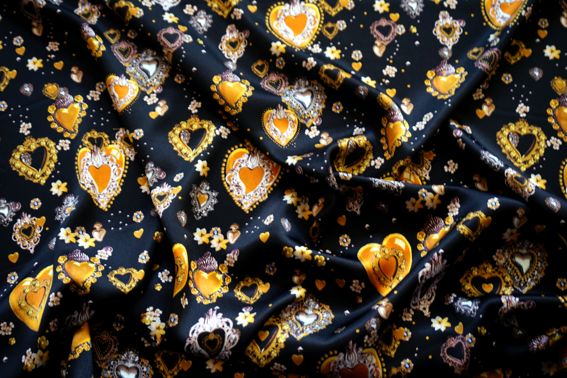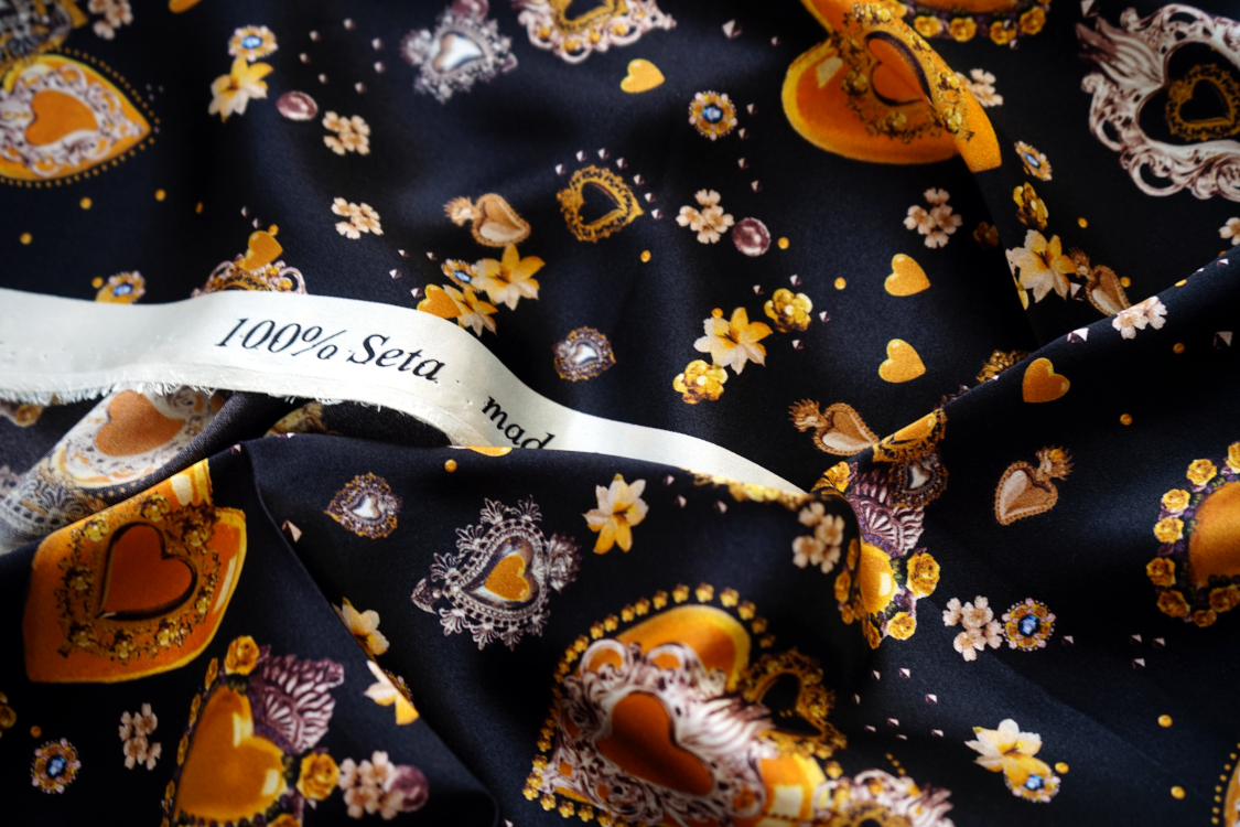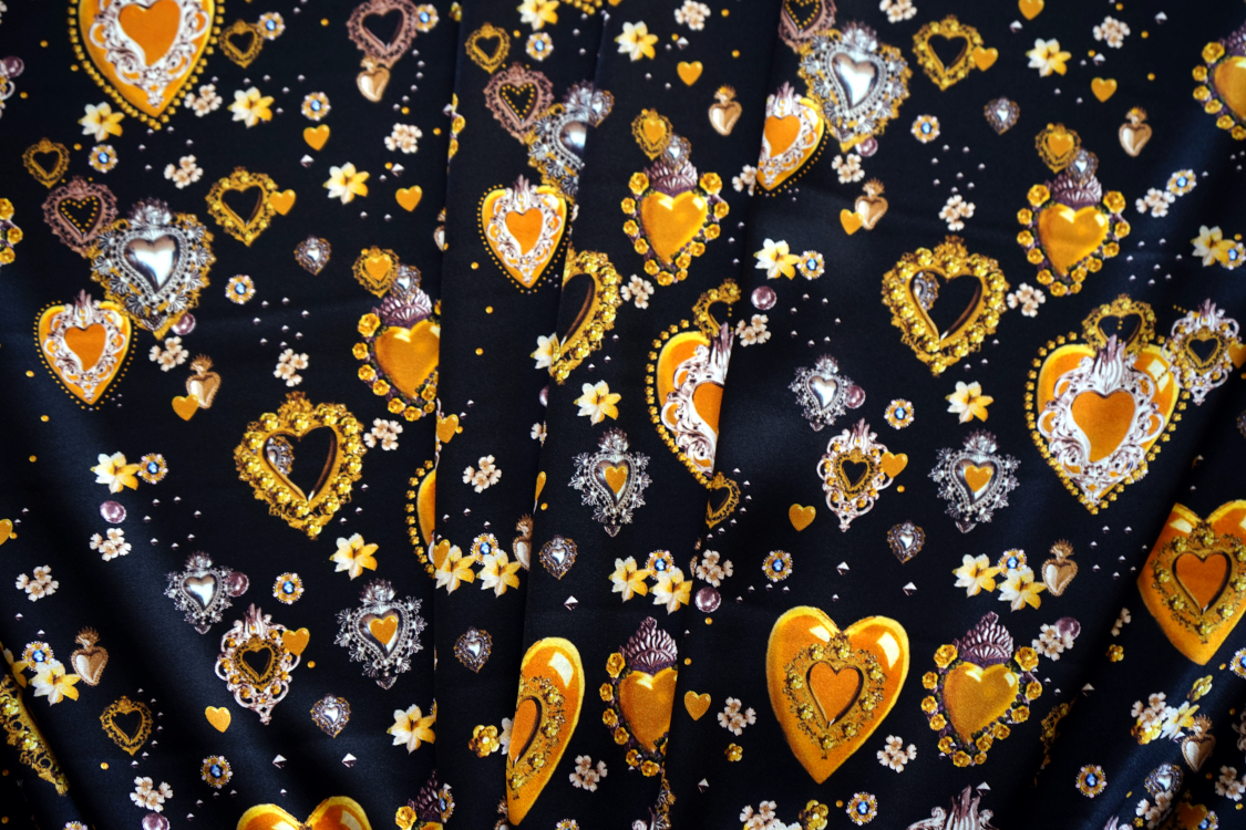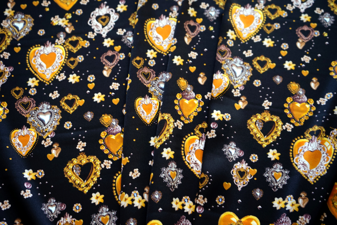 Najwyższej jakości włoska satyna jedwabna- biżuteryjne serca w stylu D&G. Tkanina jest miękka, lejąca, świetnie się układa. Nadaje się na sukienki, spódnice, koszule, bluzki, tuniki, kimona, ekskluzywne szlafroki. Nie wymaga podszewki. Gramatura ok. 100-110 gr/m2.