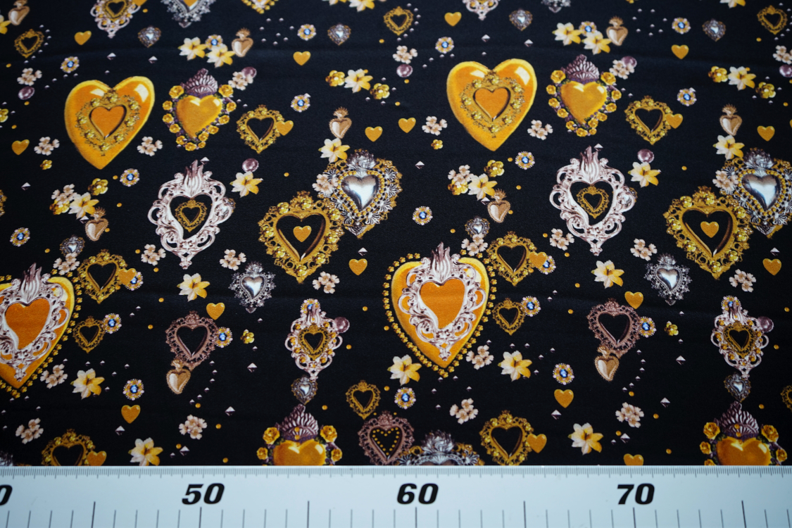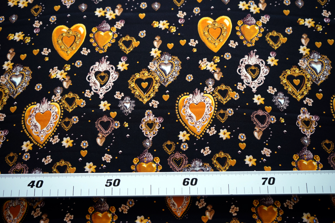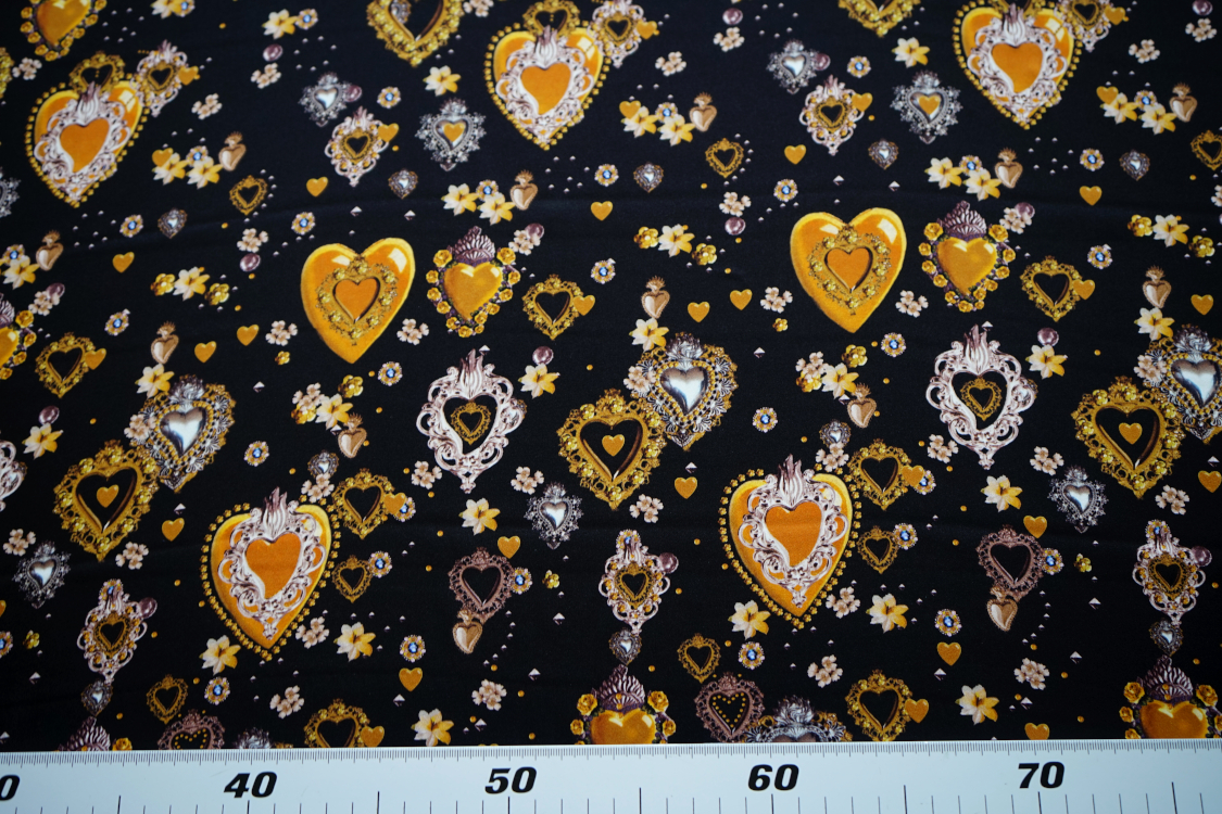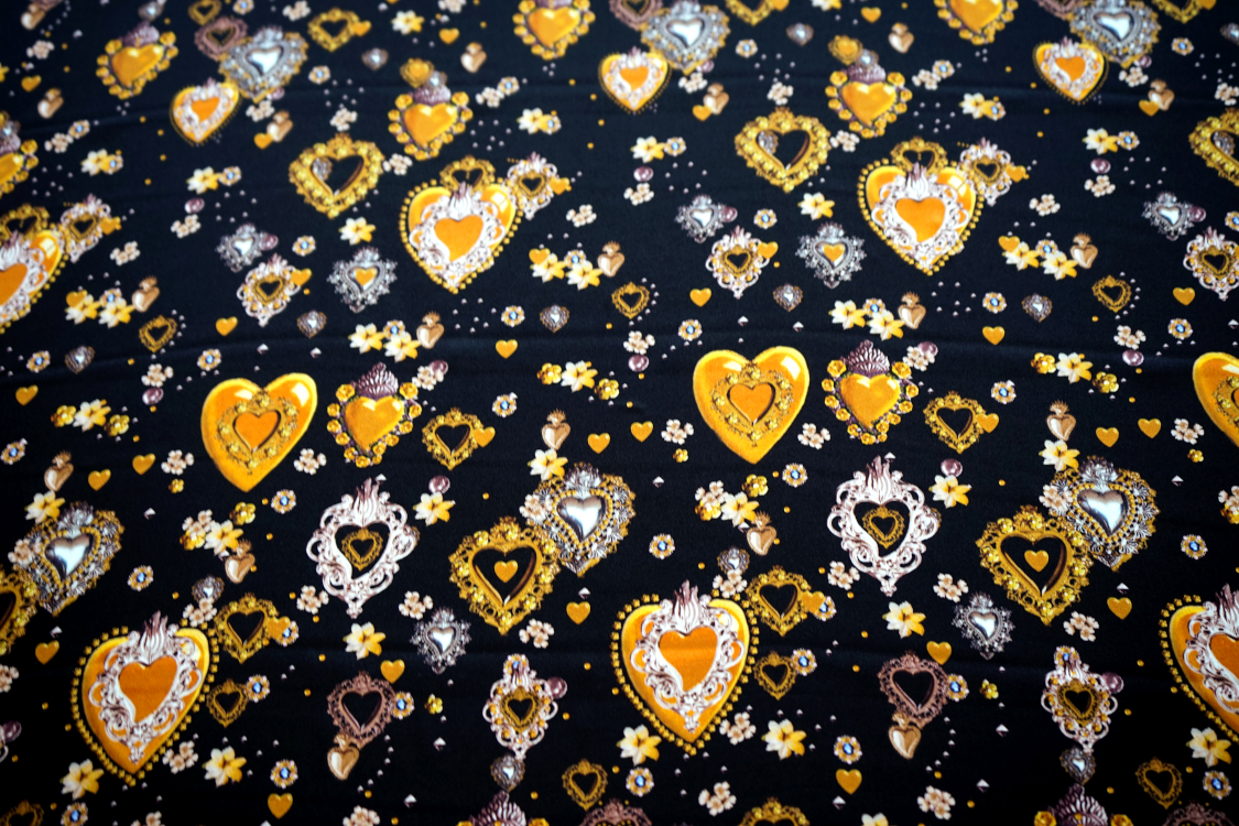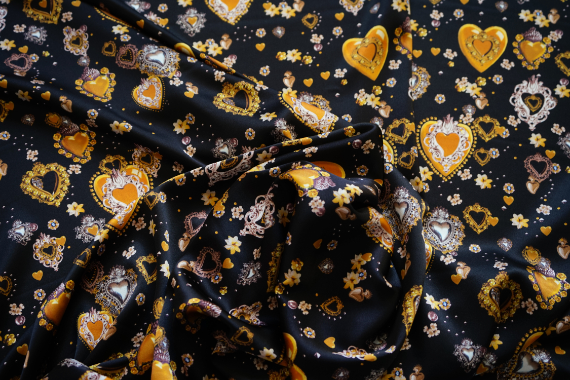 Najwyższej jakości włoska satyna jedwabna- biżuteryjne serca w stylu D&G. Tkanina jest miękka, lejąca, świetnie się układa. Nadaje się na sukienki, spódnice, koszule, bluzki, tuniki, kimona, ekskluzywne szlafroki. Nie wymaga podszewki. Gramatura ok. 100-110 gr/m2.