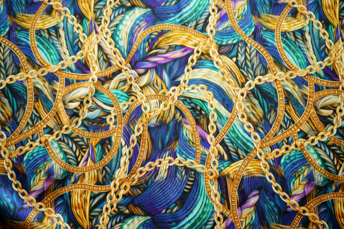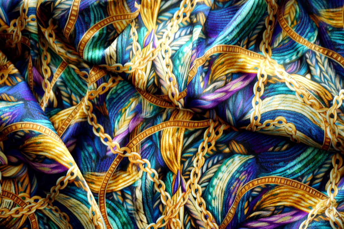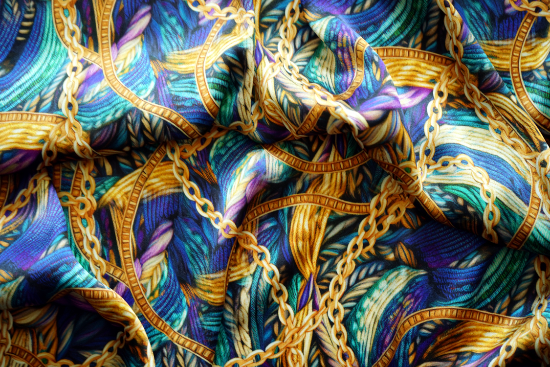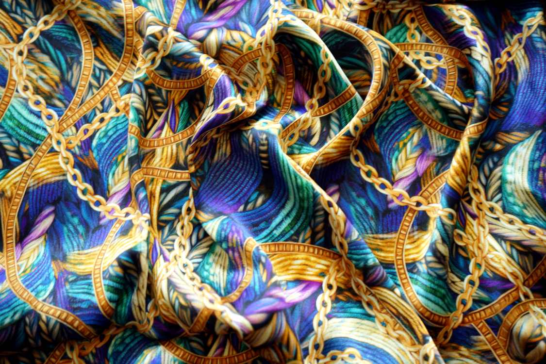 Najwyższej jakości włoska satyna jedwabna- fantazyjny wzór w turkusach i fioletach. Tkanina jest miękka, lejąca, świetnie się układa. Nadaje się na sukienki, spódnice, koszule, bluzki, tuniki, kimona, ekskluzywne szlafroki. Nie wymaga podszewki. Gramatura ok. 100-110 gr/m2.