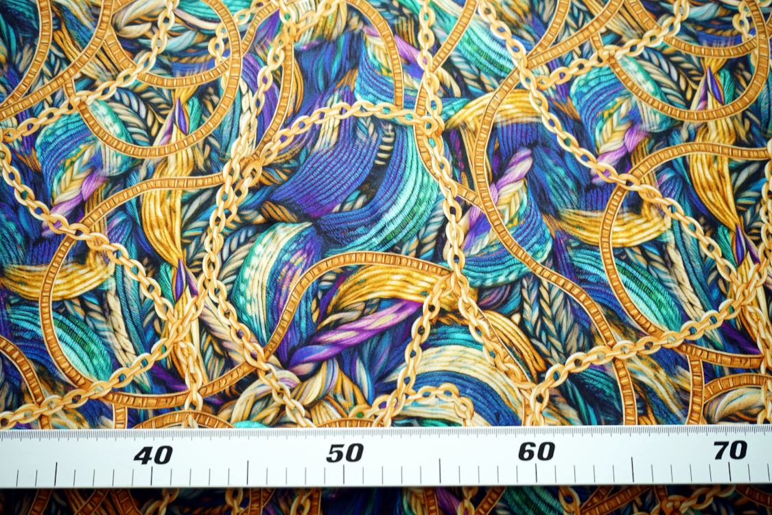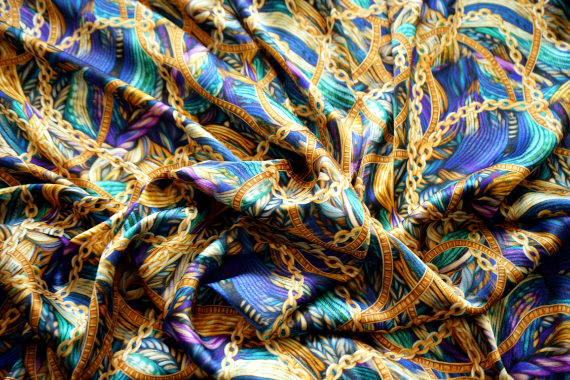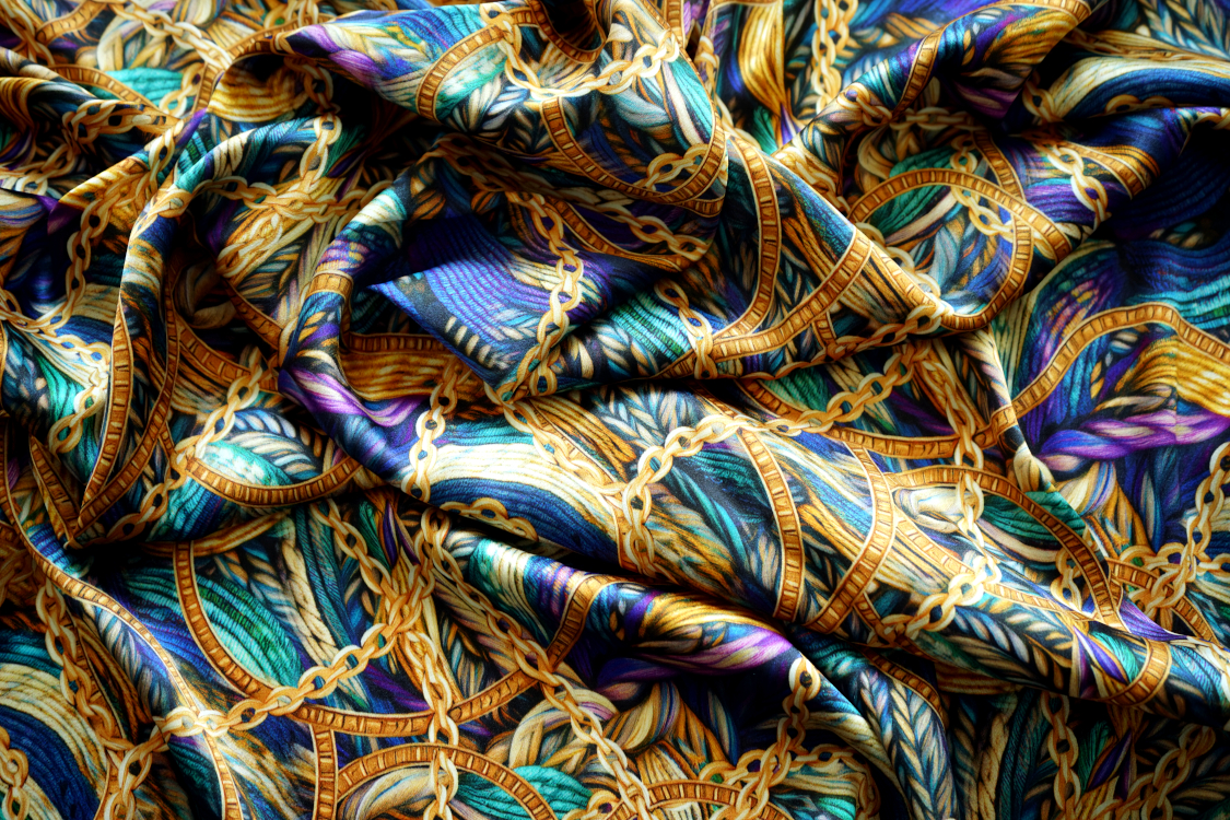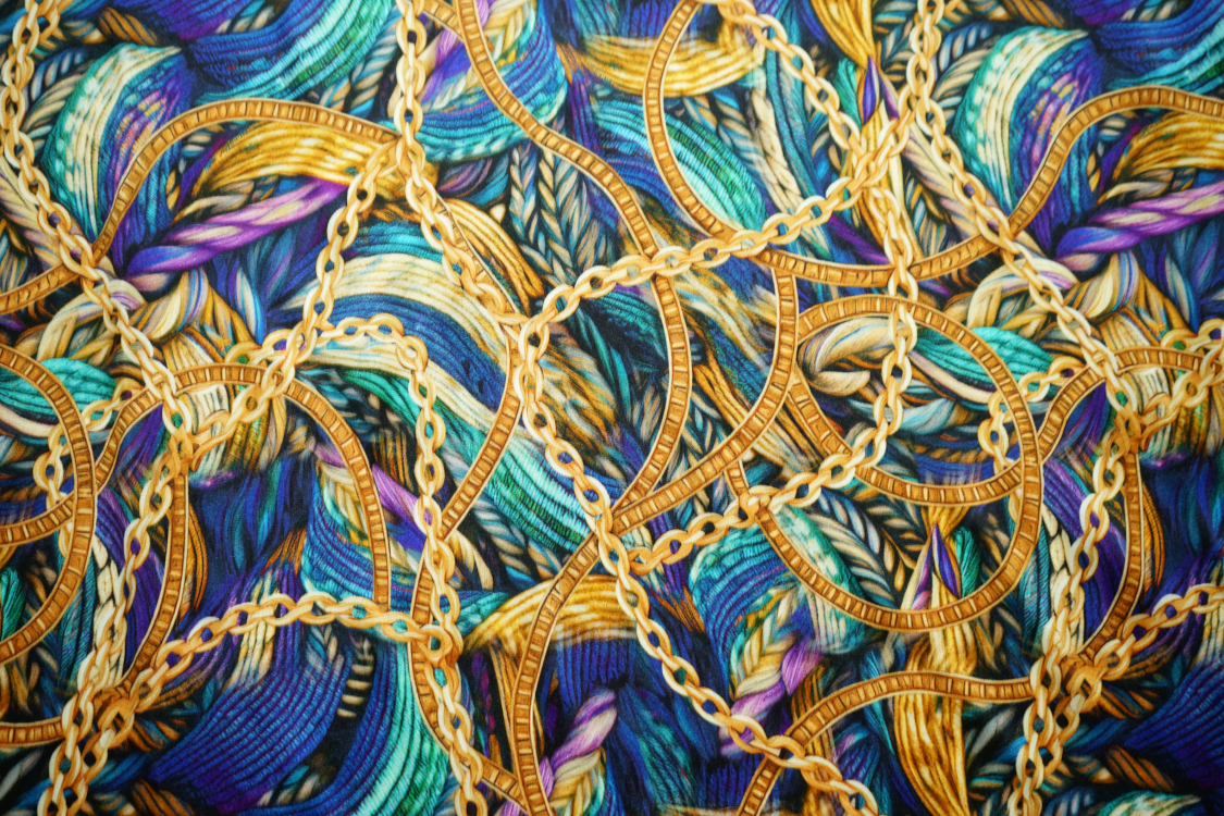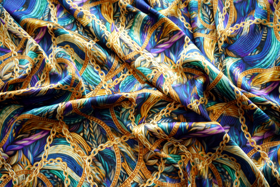 Najwyższej jakości włoska satyna jedwabna- fantazyjny wzór w turkusach i fioletach. Tkanina jest miękka, lejąca, świetnie się układa. Nadaje się na sukienki, spódnice, koszule, bluzki, tuniki, kimona, ekskluzywne szlafroki. Nie wymaga podszewki. Gramatura ok. 100-110 gr/m2.