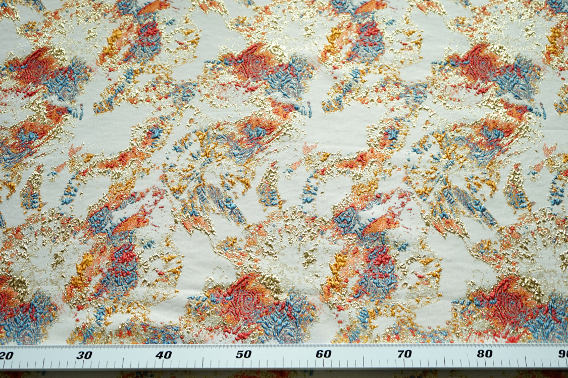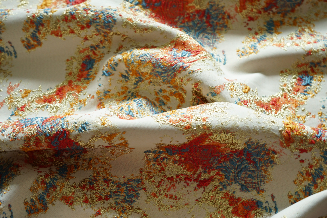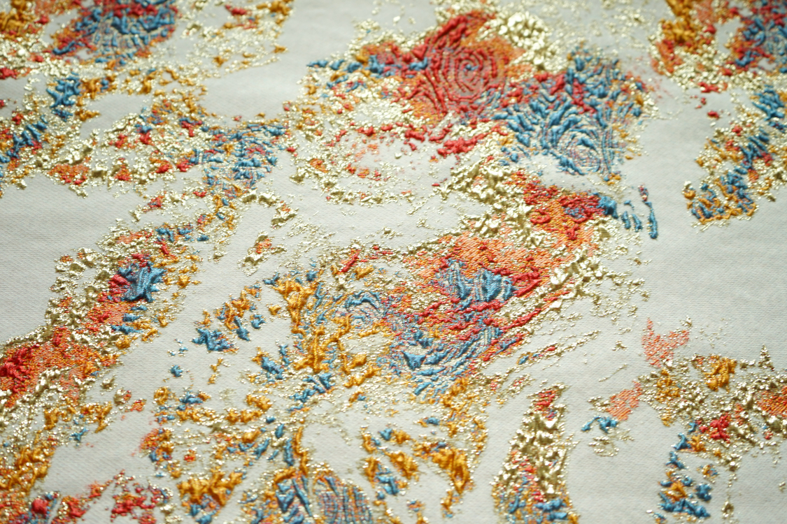 Niezwykle szlachetna tkanina żakardowa z dodatkiem złotej nitki. Piękny, bardzo elegancki wzór. Tkanina jest lekko sztywna, ale plastyczna. Nadaje się na wszelkie wizytowe kreacje, lekkie płaszczyki oraz dekoracje. Jest całkowicie kryjąca. Gramatura ok. 280 gr/mb.