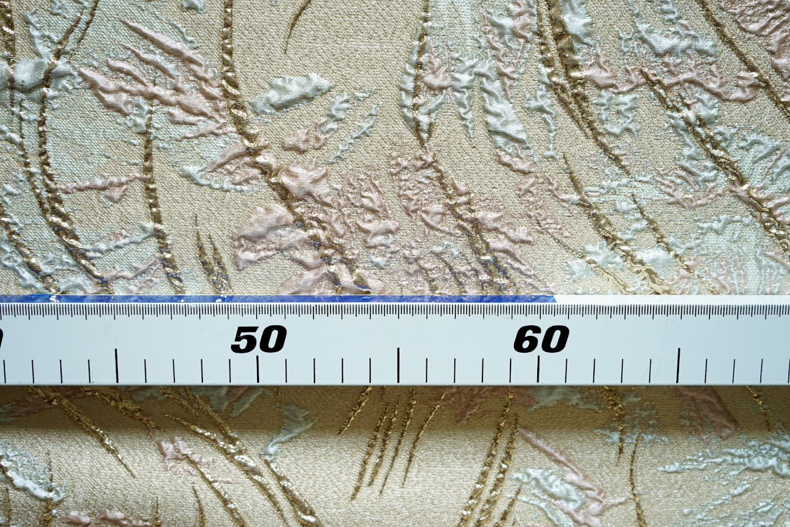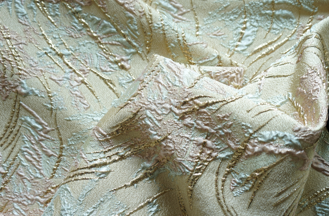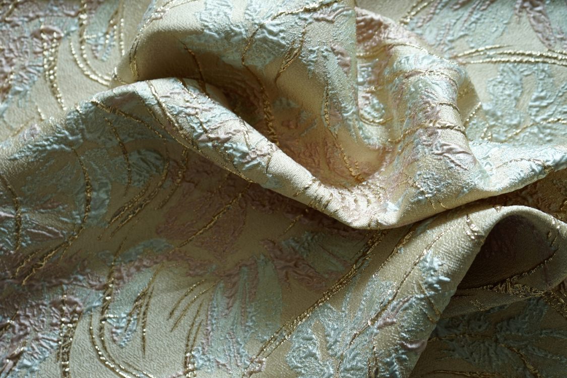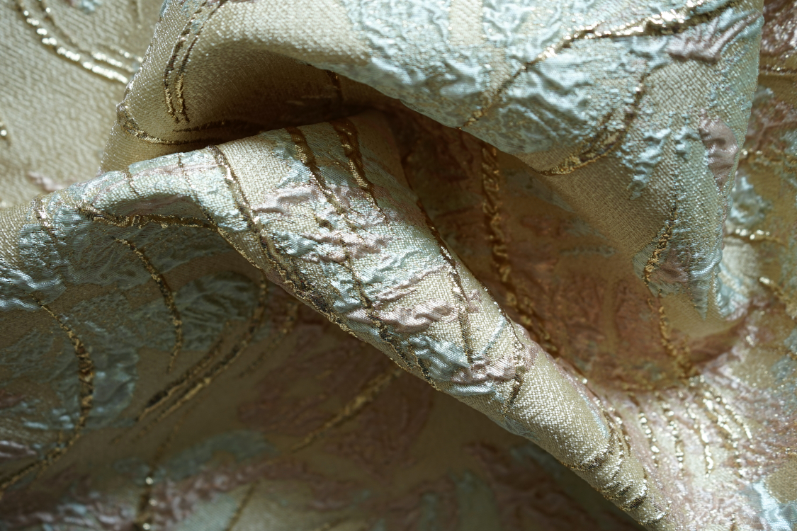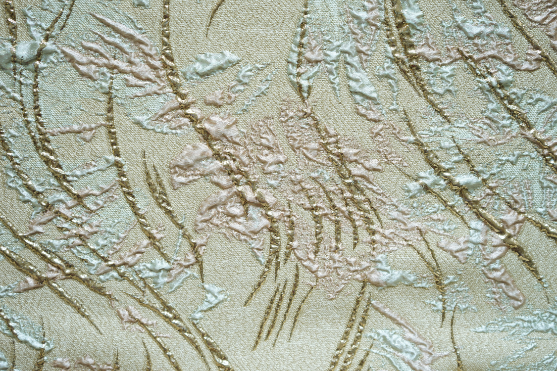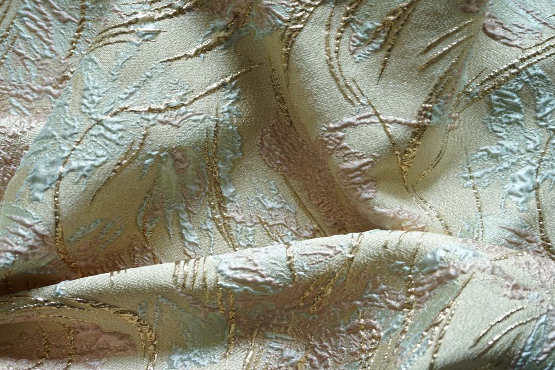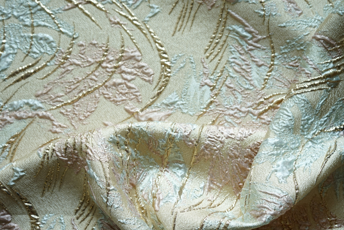 Niezwykle szlachetna tkanina żakardowa z dodatkiem złotej nitki. Piękny, elegancki wzór i pastelowe kolory. Tkanina jest lekko sztywna, ale plastyczna. Nadaje się na wszelkie wizytowe kreacje oraz dekoracje. Jest całkowicie kryjąca. Gramatura ok. 260 gr/mb.